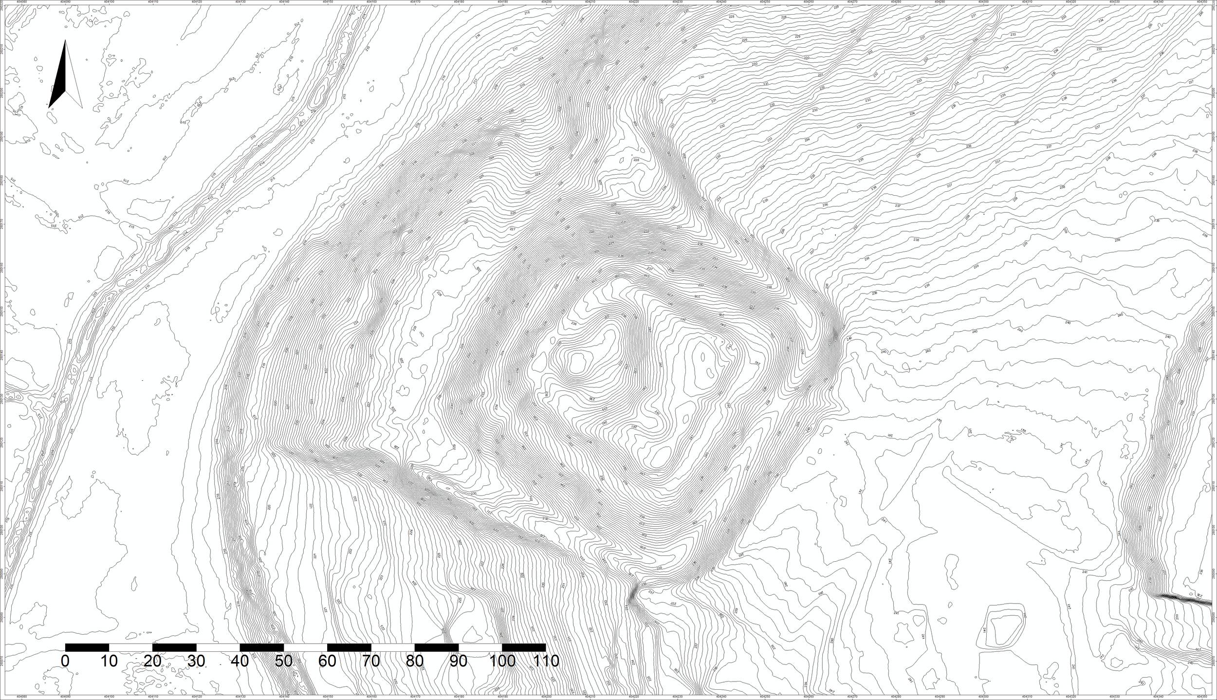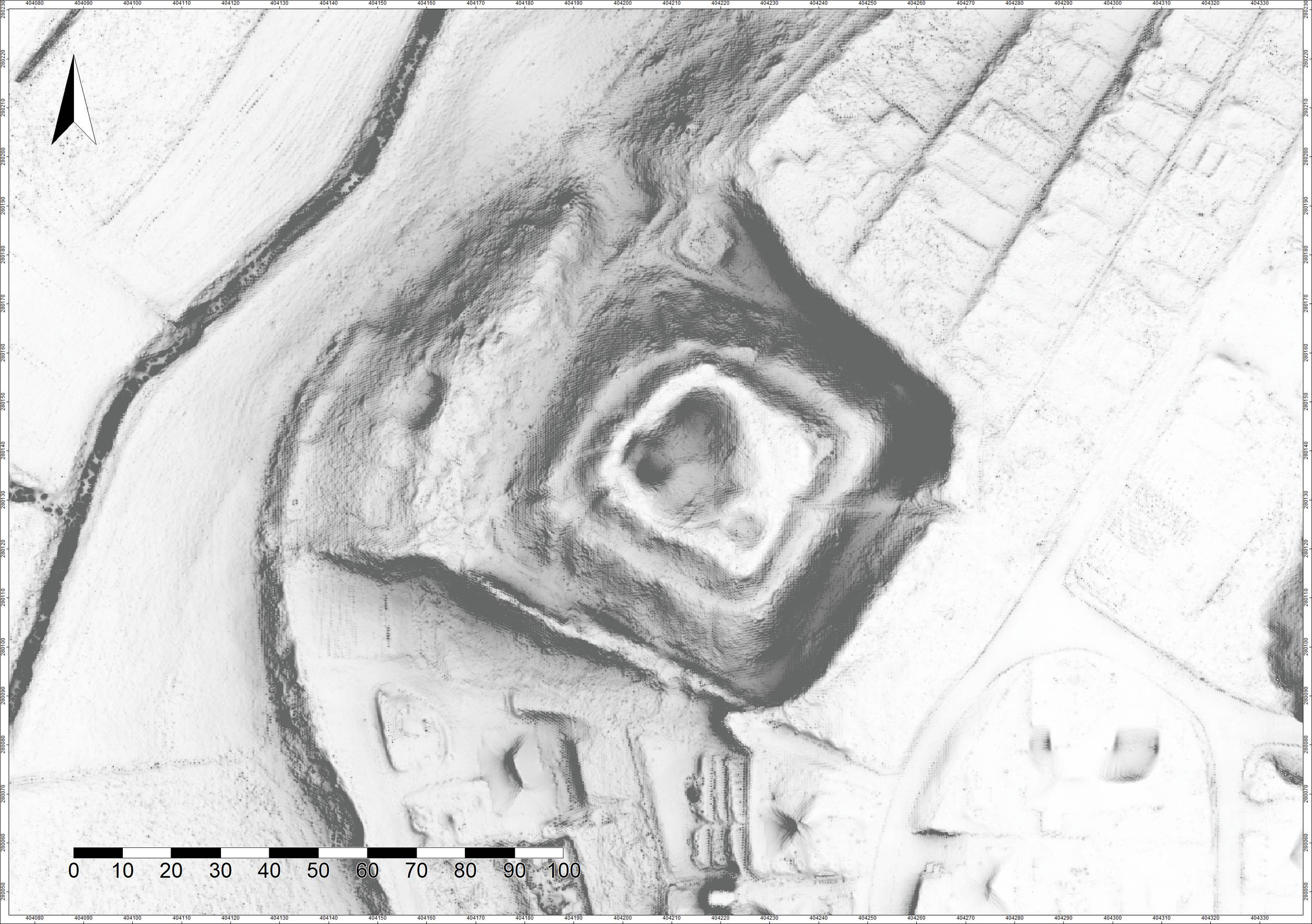 BIAŁA st. 1, widok 3D modelu stanowiska od zachodu, na podstawie numerycznego modelu terenu (opracowanie: M. Legut-Pintal, Katalog Zamków i Dworów Obronnych Śląska [https://zamki.pwr.edu.pl/]. Licencja: CC BY-NC 4.0 [https://creativecommons.org/licenses/by-nc/4.0/])
