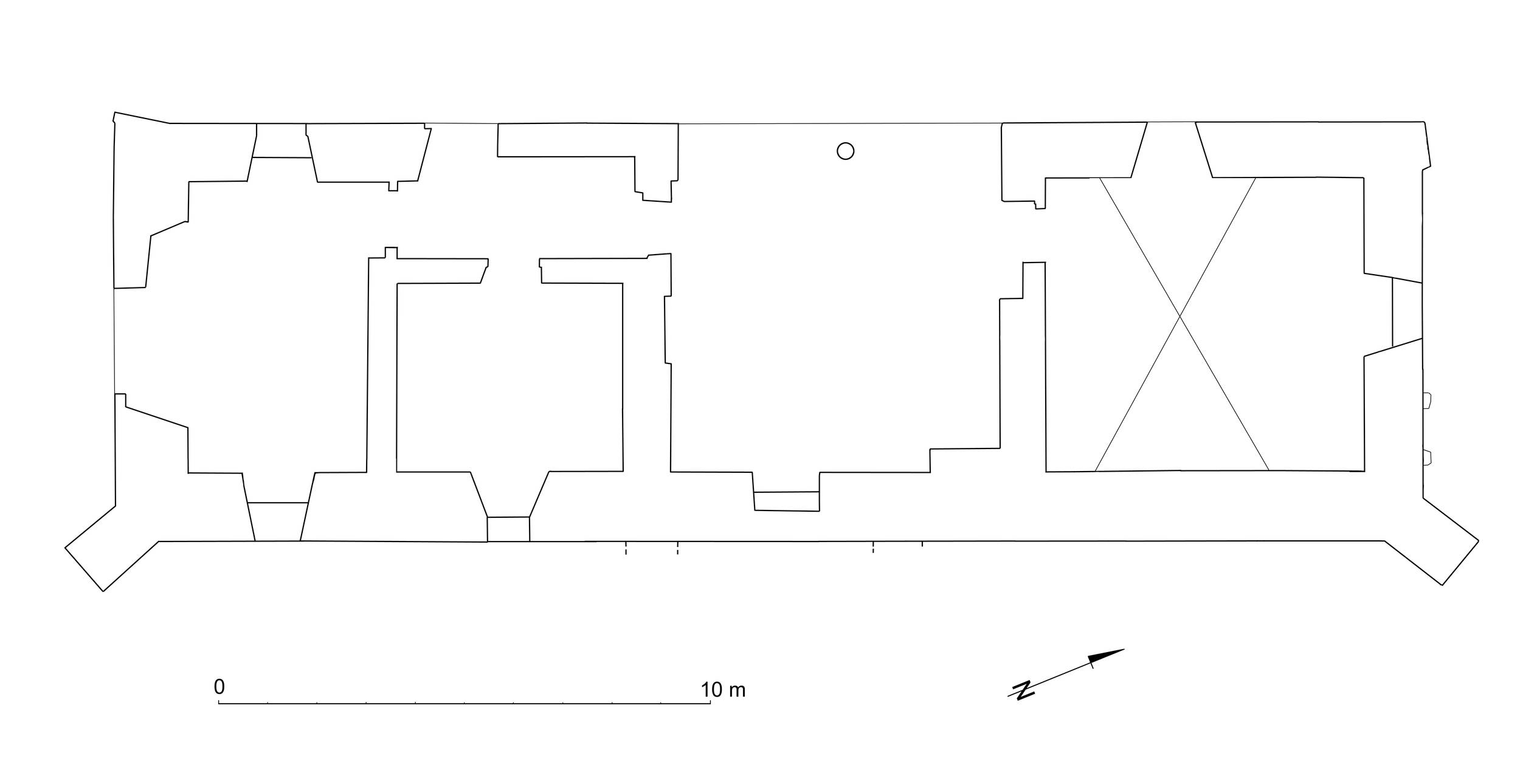 Relikty średniowiecznego dworu wzniesiono z kamienia łamanego, spajanego zaprawą wapienną, na planie wydłużonego prostokąta o wymiarach ok. 26,5 x 8,5 m, ze skośnymi przyporami w narożach (ryc. 4). Późniejsze przebudowy w dużej mierze zatarły lub zniszczyły pierwotne elementy budowli. Najwięcej czytelnych reliktów zachowało się w elewacji wschodniej (ryc. 5). W dolnej partii muru widoczne są trzy zamurowane otwory szczelinowe. W części centralnej znajduje się zamurowany i częściowo zniszczony portal wejściowy, po bokach którego czytelne są ślady po skutych przyporach. Nad łukiem portalu widoczna jest kolejna zamurowana szczelina (ryc. 6). Na południe od portalu oraz przypory wtórnie wstawiono renesansowe okno, obmurowane cegłą. W górnej partii muru, na całej długości elewacji, zachowały się gniazda po belkach.