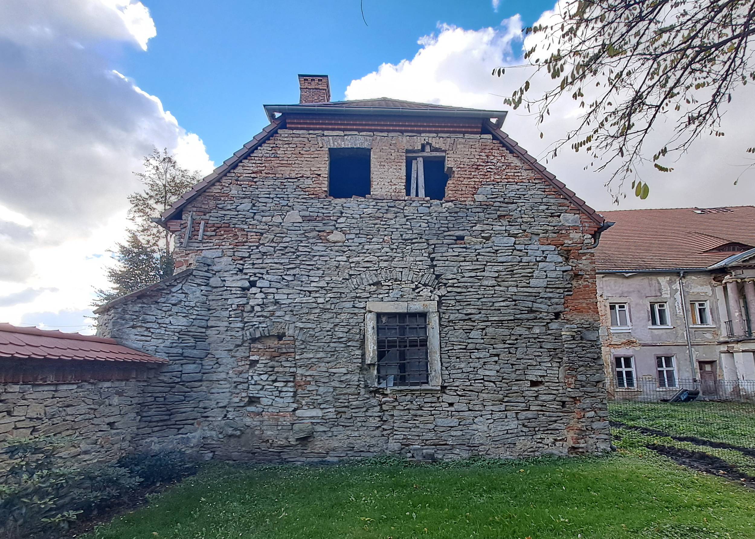 Za pierwotny element założenia należy uznać także niewielki otwór w północnej elewacji szczytowej, przesklepiony łukiem odcinkowym. W jego dolnej partii zachowały się dwa kamienne kroksztyny (wykusz) (ryc. 7). W centralnej części elewacji widoczne jest również renesansowe okno z ciosów piaskowcowych, z żelazną kratą i profilowanym parapetem. Najbardziej przekształcona jest elewacja zachodnia. W jej północnej części zachował się otwór drzwiowy, przekryty łukami odcinkowymi i rozglifiony do wnętrza (ryc. 8). Pomieszczenie, do którego prowadzi, nakryto sklepieniem krzyżowym, pokrytym tynkiem, przy czym łuki szwów podkreślono żebrami wypracowanymi w tynku. Mniej więcej w centralnej części elewacji zachodniej widoczny jest fragmentarycznie zachowany, zamurowany otwór okienny (?) z kamienia łamanego, zamknięty łagodnym łukiem. Dwór przedstawiony na rycinach F.B. Wernera był budynkiem dwukondygnacyjnym, z użytkowym poddaszem oraz wysokimi szczytami schodkowymi.