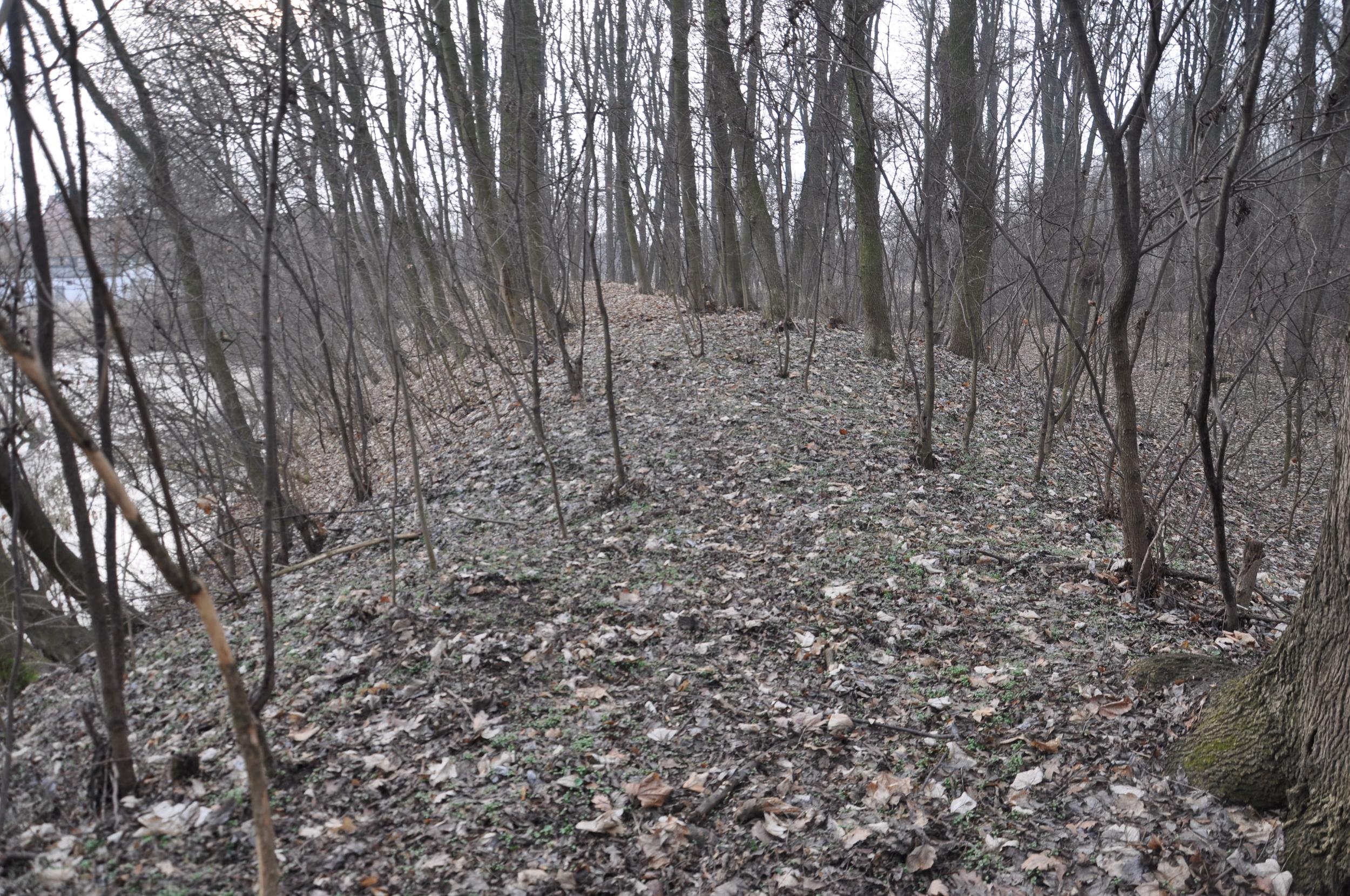 Relikty niezidentyfikowanego założenia obronnego zachowały się w postaci rozległego nasypu o planie zbliżonym do kwadratu z zaokrąglonymi narożami. Długość boków wynosi 75–77 metrów, a wysokość w części północnej sięga około 5 metrów. Kopiec otacza fosa o szerokości 18–22 metrów, która w części południowo-wschodniej jest przecięta szeroką groblą. Na zewnątrz fosy częściowo zachował się wał o szerokości 12 metrów, który od strony północno-zachodniej rozszerza się do ponad 20 metrów.