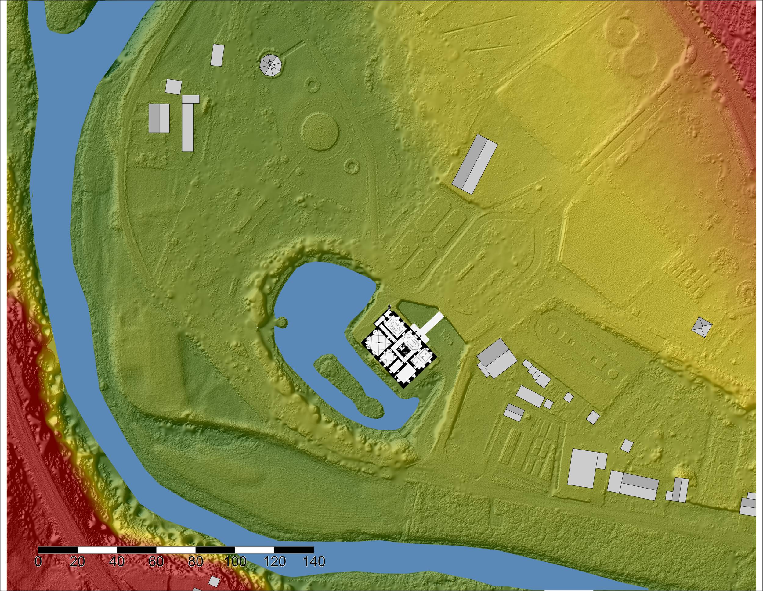 Dopełnienie reprezentacyjnego programu budowli pałacowej stanowiły: „przedogródek” w obrębie podwórca folwarcznego poprzedzający fasadę, ogród ozdobny (z pawilonami, stawem, fontannami, kopcami, labiryntem itd.) oraz park-zwierzyniec. Zamkowy charakter budowli — demonstrowany poprzez usytuowanie pałacu na wyspie — został dodatkowo wzmocniony poprzez most zwodzony nad kanałem łączącym stawy, „ryglujący” drogę dojazdową.