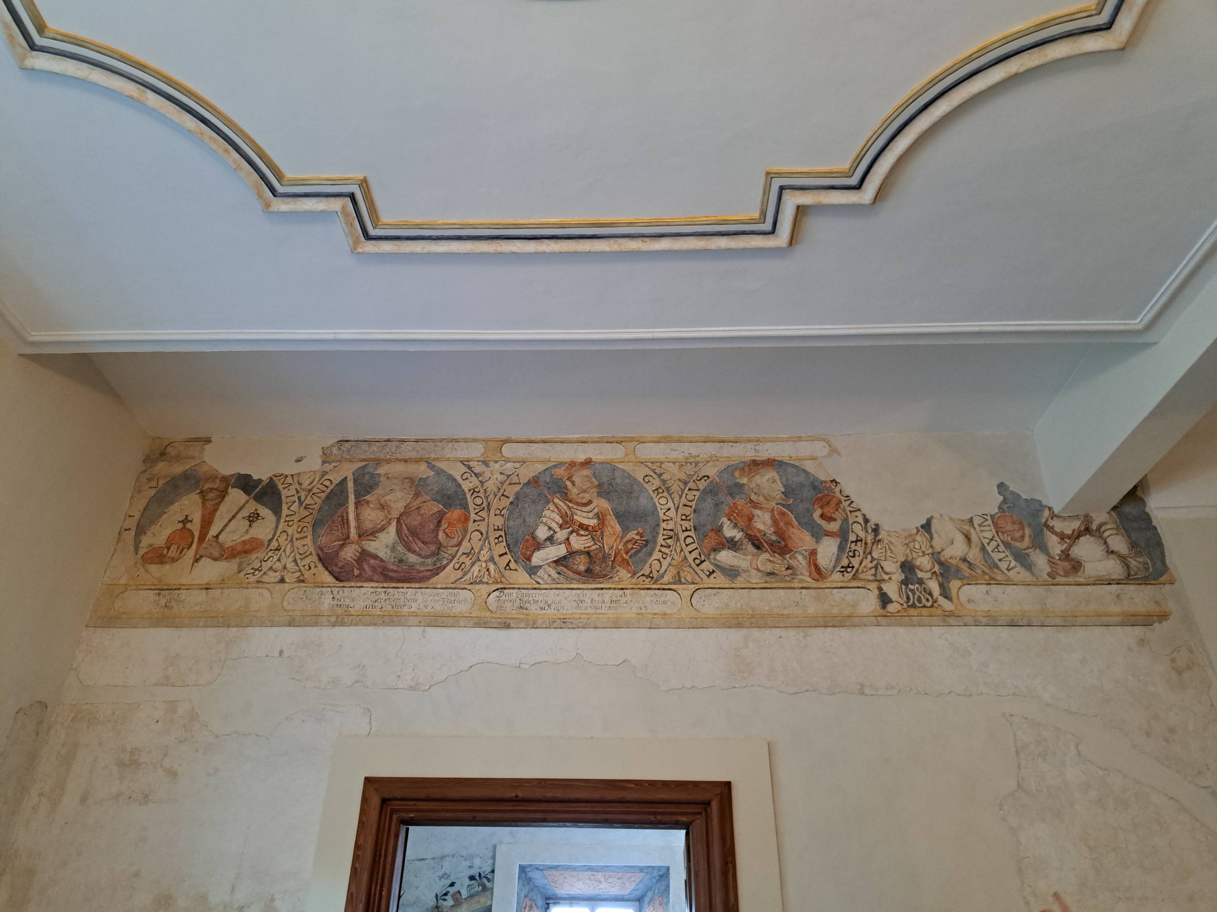 Najbardziej spektakularnym efektem prac był wystrój malarski największego pomieszczenia dworu, które zajęło ¾ powierzchni przedniego traktu na kondygnacji piętra. Obejmował on m.in. zespół portretów cesarzy umieszczony w partii podstropowej. Za wzorzec medalionowych przedstawień i towarzyszących im inskrypcji posłużyły ilustracje zamieszczone w księdze Huberta Goltziusa, *Lebendige Bilder Gar Nach Allen Keysern (…) * wydanej w Antwerpii w 1557 r. Wg Andrzeja Kozioła wystrój sali stanowił polityczną demonstrację – wyraz hołdu złożonego cesarzowi Maksymilianowi II przez Heinricha von Reichenbach (uczestnika pogrzebu tego władcy w 1577 r.) w obliczu absolutystycznej polityki jego następcy, Rudolfa II Habsburga (Kozioł 2024). Analogiczna galeria cesarzy została zrealizowana w Strudze, w „Tafelstube” położonej w skrzydle północno-zachodnim – także tam źródłem był Goltzius (Kozioł 2024).