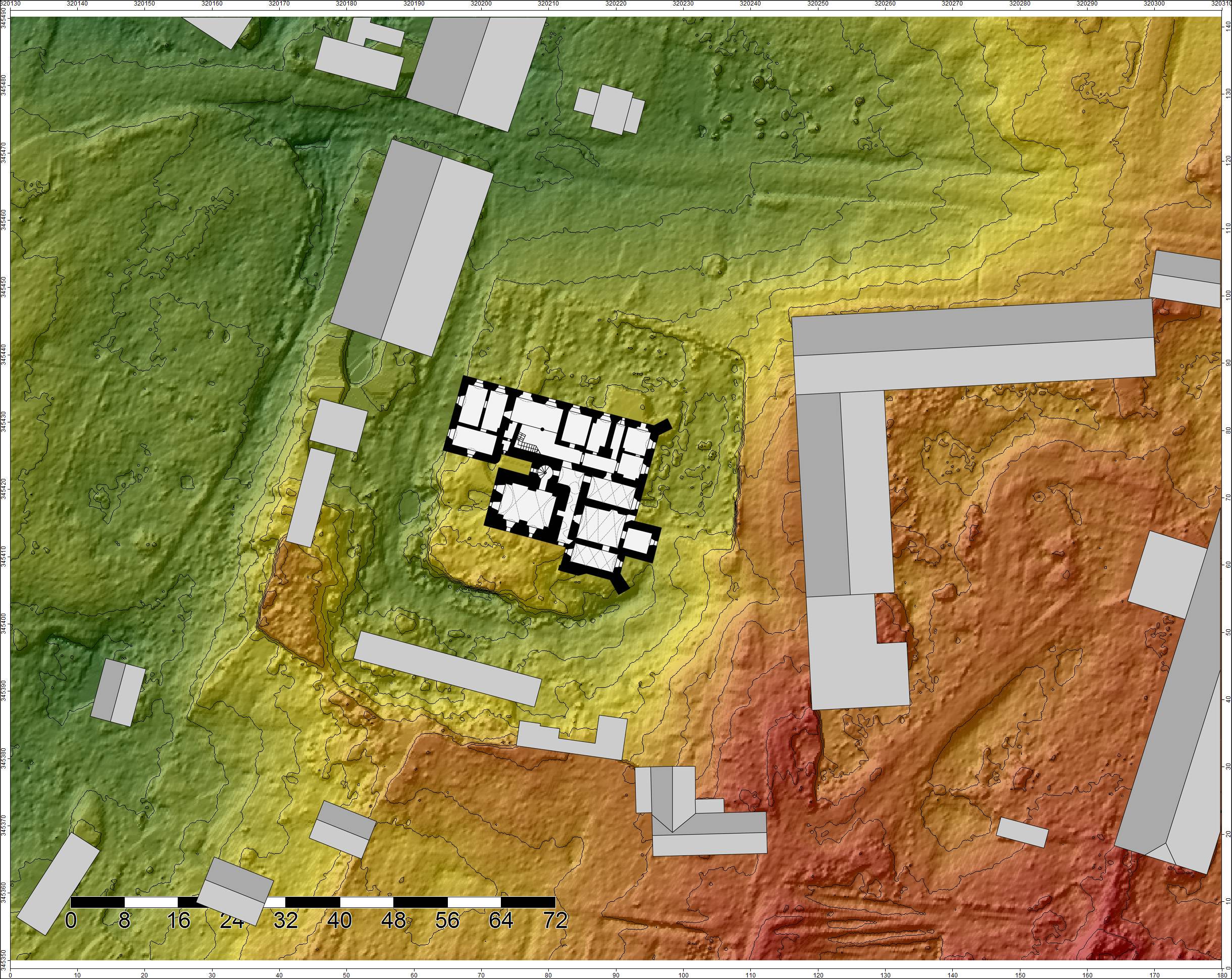 Prawdopodobnie również w tym czasie ostatecznie ukształtowano zabudowę majdanu towarzyszącą wieży – wznosząc na obrzeżach wyspy dwuskrzydłowy budynek o dwóch kondygnacjach, oskrzydlający wieżę od wschodu i północy. Rozplanowanie tego budynku ulegało późniejszym przekształceniom, ale da się ustalić, że skrzydło północne, jednotraktowe, mieściło w części środkowej obszerną sień krytą stropem; od zachodu przylegała izba z komorą, od wschodu – być może główna izba dworska. Skrzydło wschodnie zawiera w przyziemiu trzy sklepione pomieszczenia o nieustalonym przeznaczeniu. Do jednego z nich przylega kuchnia, umieszczona w parterowym aneksie dobudowanym wtórnie do jego fasady. Aneks ten dziś jest zasklepiony, ale jeszcze w latach 80. XIX w. ponad całym wnętrzem (ok. 3,5 × 3,4 m) wznosił się potężny komin okapowy.