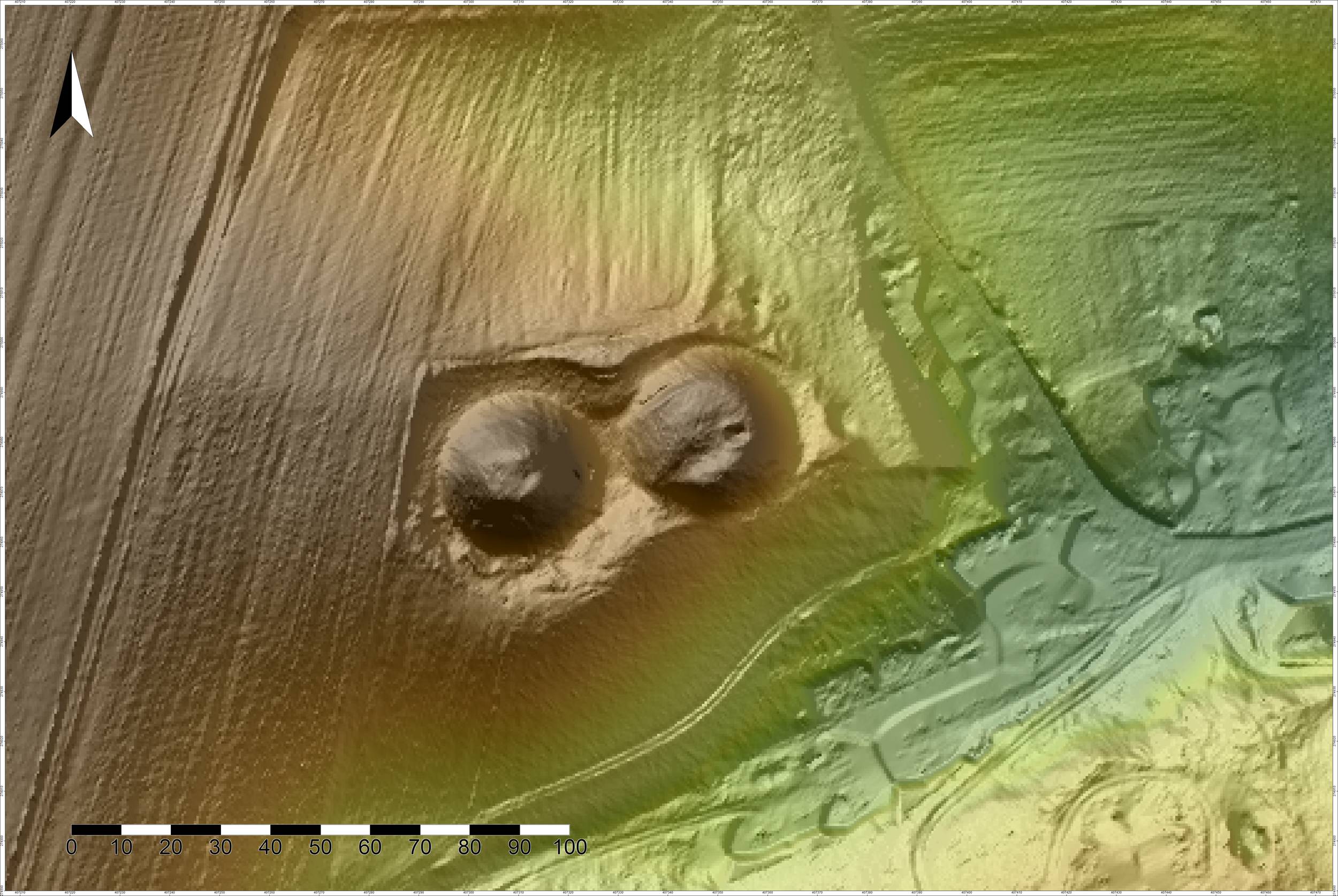 Podczas badań sondażowych stwierdzono występowanie na stożkach warstwy kulturowej, składającej się z szarej próchnicy z grudkami polepy i węgli drzewnych, o miąższości 30 cm na wyższym i 85 cm na niższym stożku. Na niższym stożku natrafiono na relikt budynku obrzuconego gliną (szachulcowego?). Podczas badań pozyskano materiał zabytkowy: 55 ułamków naczyń ceramicznych, cienkościennych, barwy szarej i jasnokremowej, z rozwiniętymi brzegami; 3 fragmenty gwoździ, ułamek osełki kamiennej, kości zwierzęce i grudki przepalonej polepy. Fotografie archiwalne wskazują, że na wyższym kopcu znajdowała się drewniana wieża (?) (Kaźmierczyk, Macewicz, Wuszkan 1977, ryc. 217).