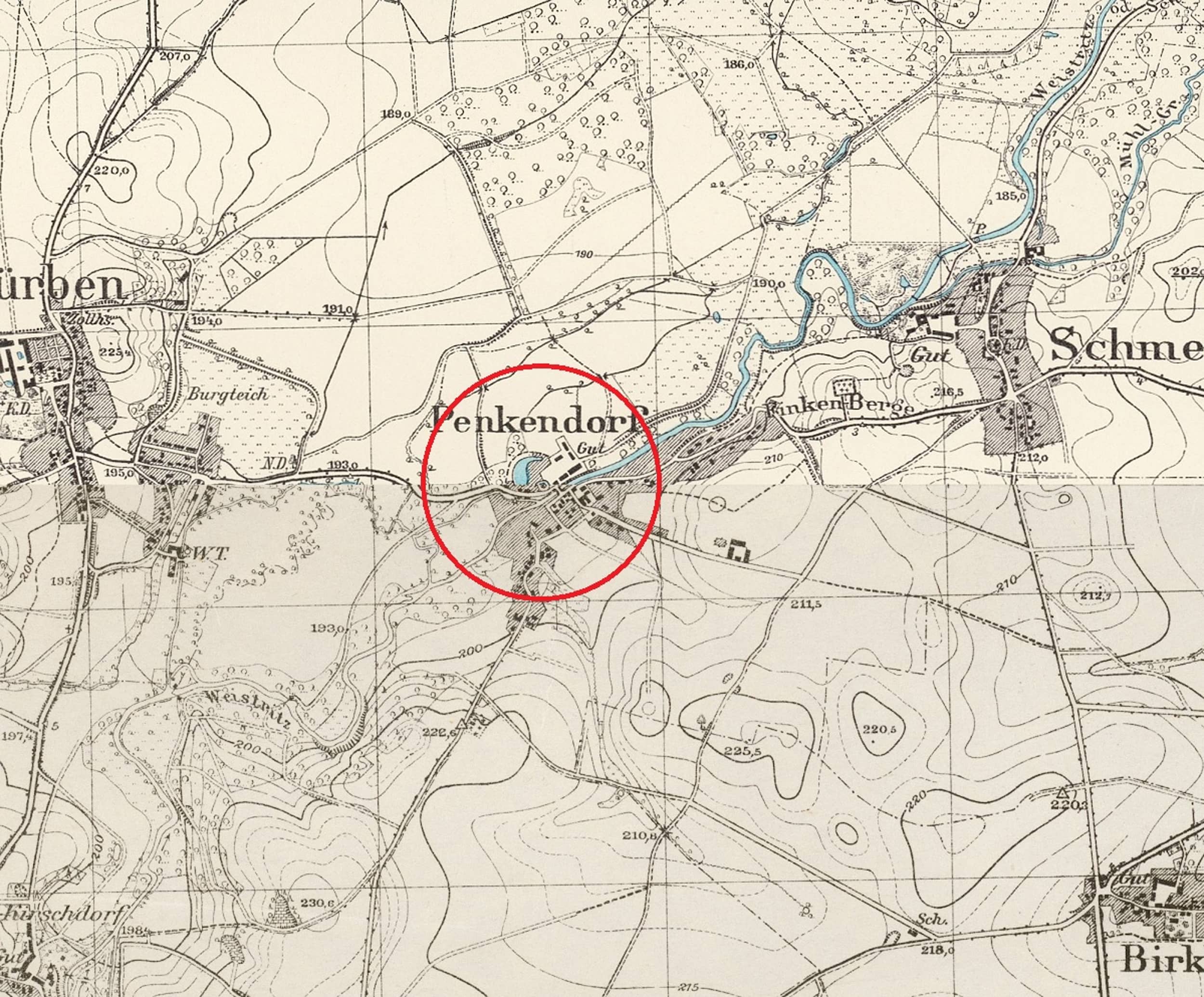 - historyczne nazwy miejscowości: 1367 – Pankinsdorf (LANDBUCH I, nr 48), 1385 – Pankendorf, (LANDBUCH II, nr 25); 1389 – vorwerk zu Pankendorf (LANDBUCH II, nr 729); 1527 – Pengkendorff (CDS XXXV, s. 153)
