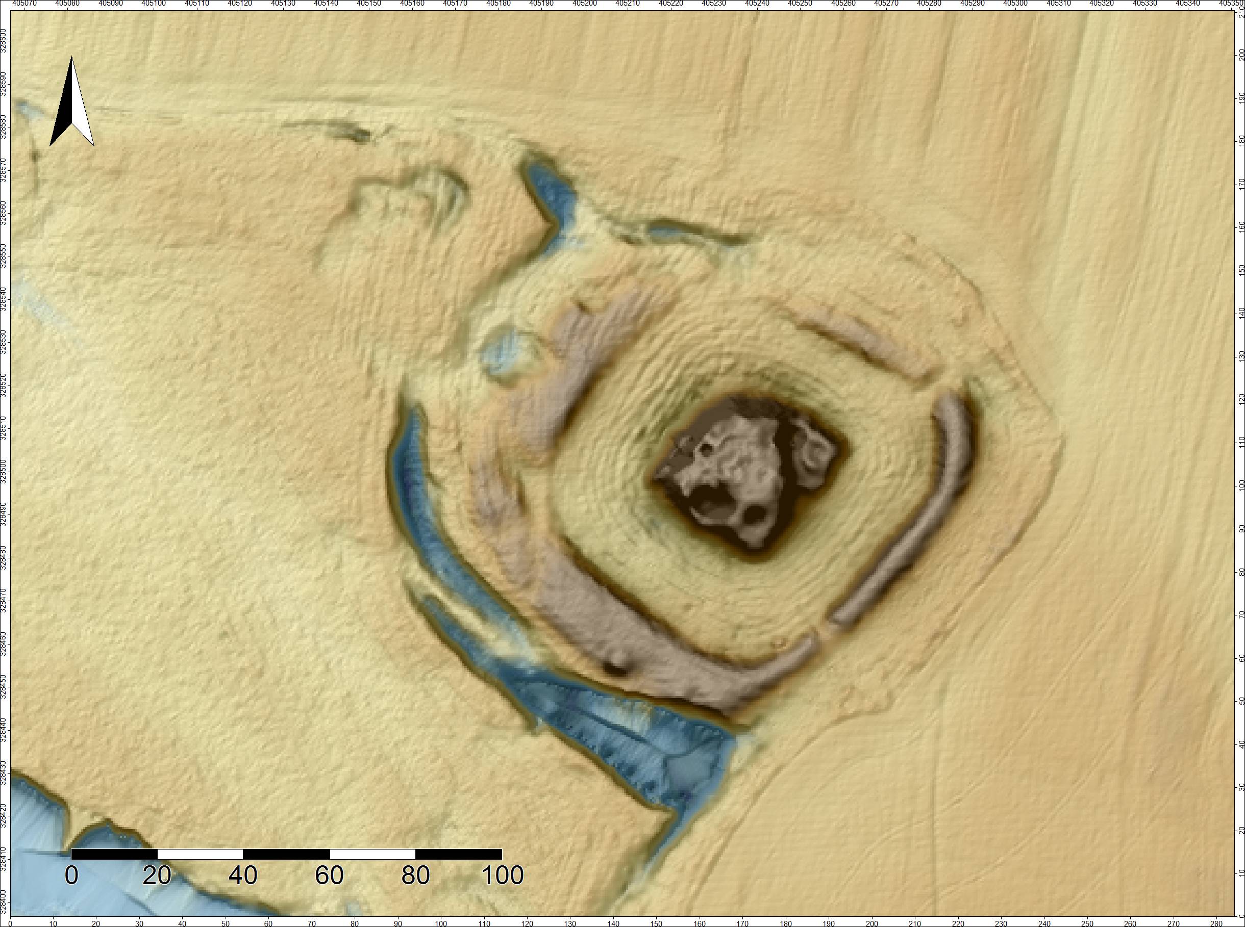 Centralny nasyp otoczony był nawodnioną fosą i wałem, a przypuszczalnie dwoma fosami. Zasypisko fosy wewnętrznej ma obecnie szerokość 18-21 m, mierzoną od podstawy nasypu do podstawy wału. Powierzchnia zasypiska fosy nosi ślady bruzd związanych z orką. Wał o zachowanej wysokości względnej do 1,5 m, otaczający pierwotnie nasyp, przerwany został w kilku miejscach: od strony południowo-wschodniej, północno-wschodniej, oraz w największym stopniu od strony północnej. Zachowana szerokość wału od strony wschodniej i północnej wynosi ok. 10 m, od strony południowej i zachodniej wał jest szerszy, ale też bardziej zniszczony – szerokość zachowanych reliktów wynosi tu do 20-30 m.