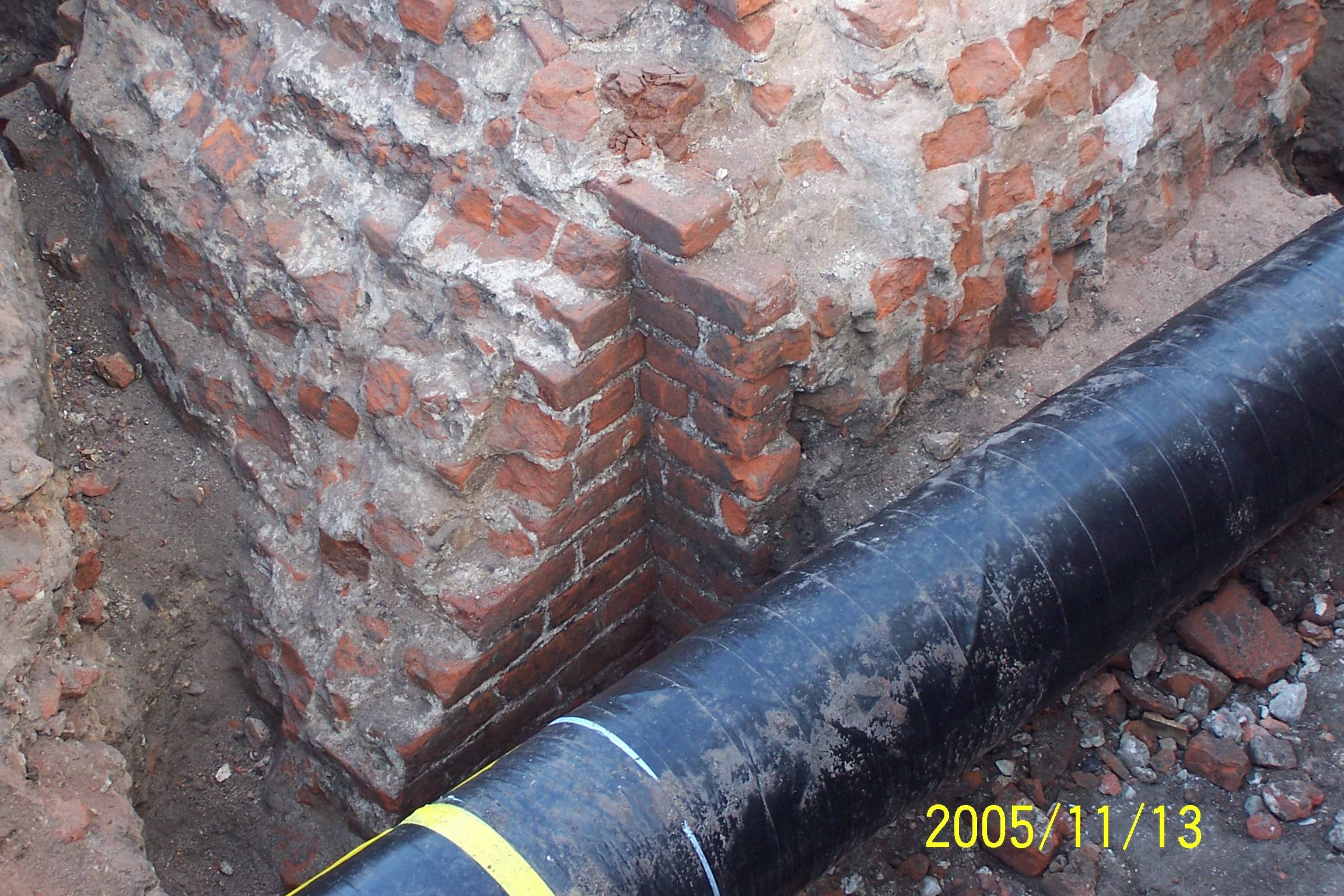 Problemy konstrukcyjne wynikające z podmokłego terenu mogły wpłynąć na cofnięcie linii muru o ok. 7 m na południe – zjawisko to J. Badura i T. Kastek (2018) wiążą z zakończeniem budowy zamkowego obwodu i początkiem prac nad miejskimi murami. W warstwach archeologicznych z 2002 r. odnotowano grubą warstwę miału ceglanego, obecnie interpretowaną jako pozostałość po budowie obwarowań miejskich – podobne ślady występują też w innych częściach miasta (np. ul. Garbary 4).