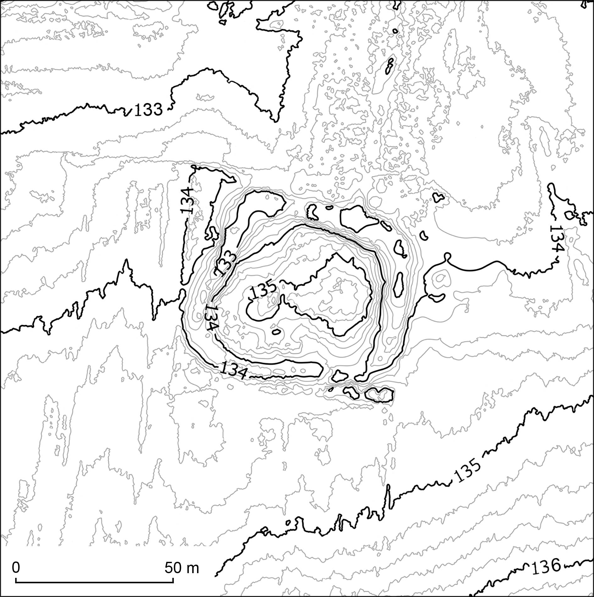 Na wysokości odwiertów 13-15, mniej więcej w centralnej części kopca, stwierdzono obniżenie (rów) wypełnione szarą próchnicą przemieszaną ze spalenizną i polepą, dzielące plateau na dwie części. W wydzielonej w ten sposób części zachodniej o szerokości około 10 m na calcu zalegała warstwa próchnicy z piaskiem, następnie czarna próchnica, a dalej ciemnożółty przewarstwiony piasek o charakterze nasypowym i miąższości 1,10 m. Na nim zalegała warstwa szarego piasku.